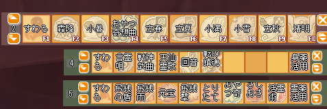 一番上がメインの陰陽師職時につかうホットキーで<ペット楽師+陰陽2種>。一番下が商人時<商人+ペット楽師>。真ん中は戦闘の合間にかける補助スキル用<人間強化楽師+商人>。